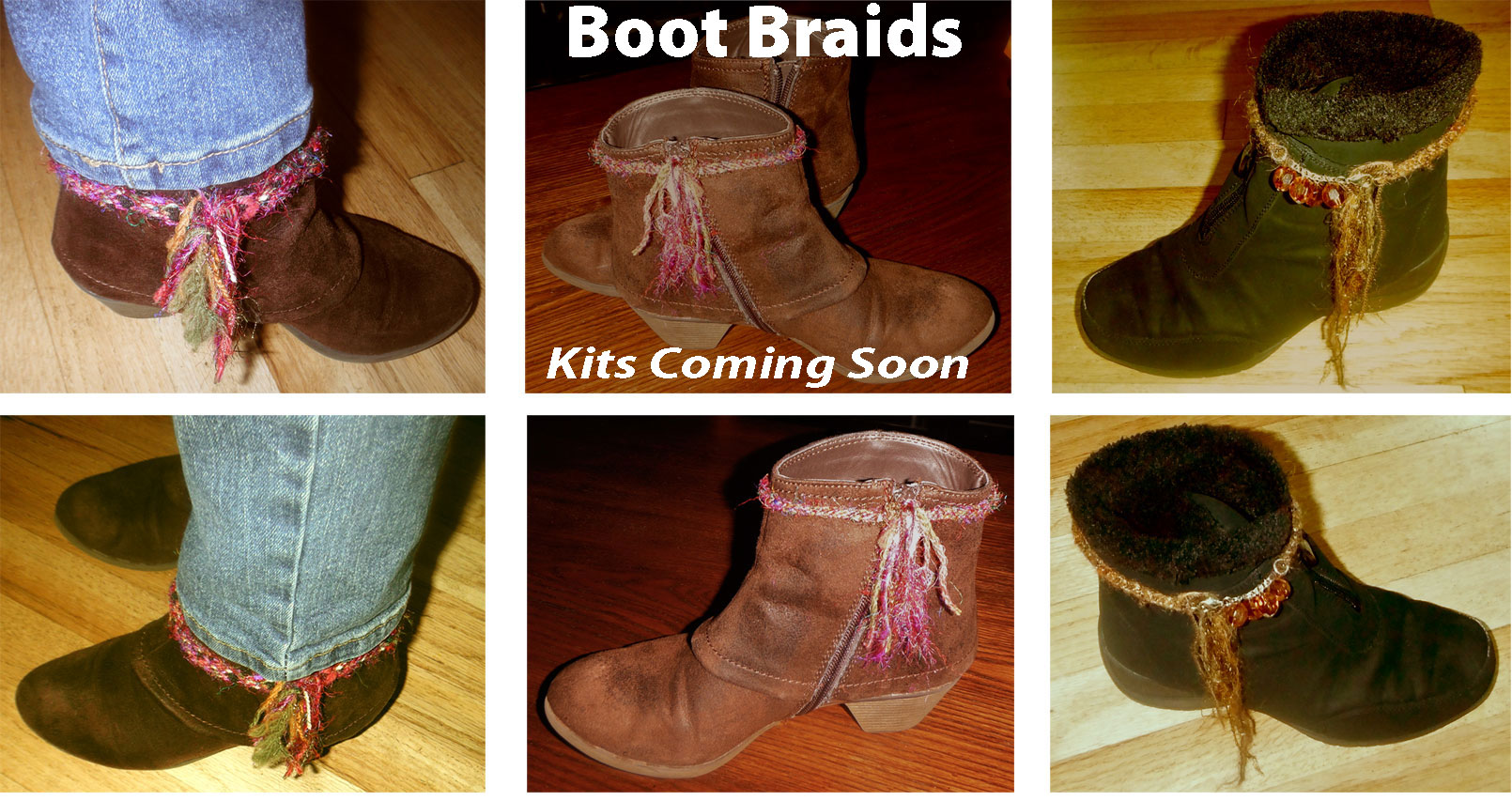 People have been enjoying making necklaces, bracelets, anklets, garlands and all kinds of braids with our various kumihimo kits. Recently while making a bracelet for my sister-in-law, I got the measurements wrong, and made it too big. I decided to try it on as an ankle bracelet. Since I had my boots on, I naturally slipped the braid over my boot. It looked totally awesome, and Boot Braids were birthed. We are working on putting together kits so everyone can begin enjoying them. Check back soon to order.